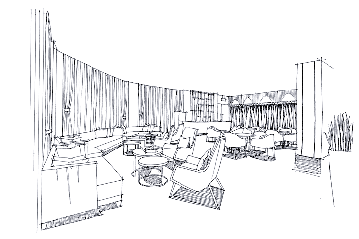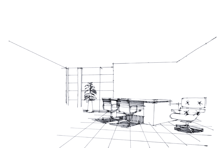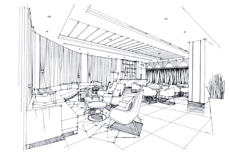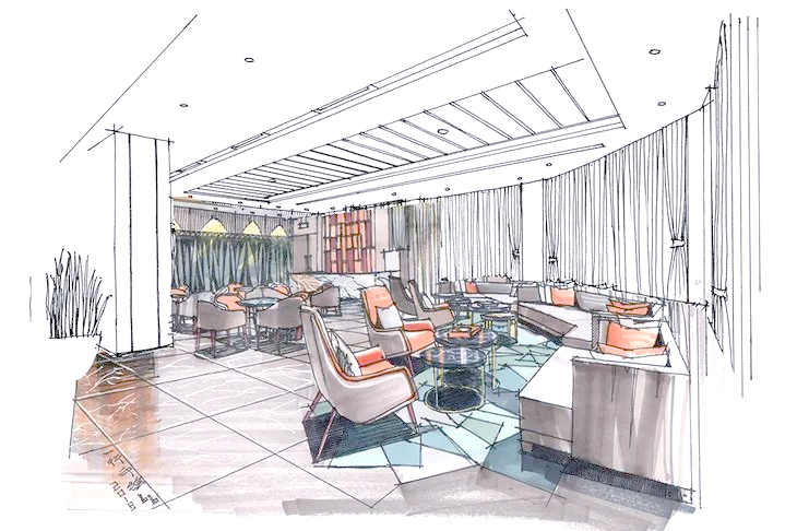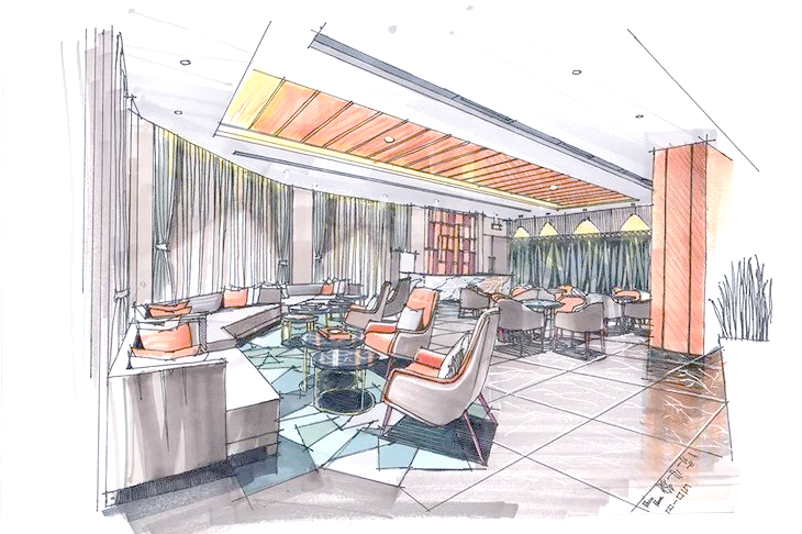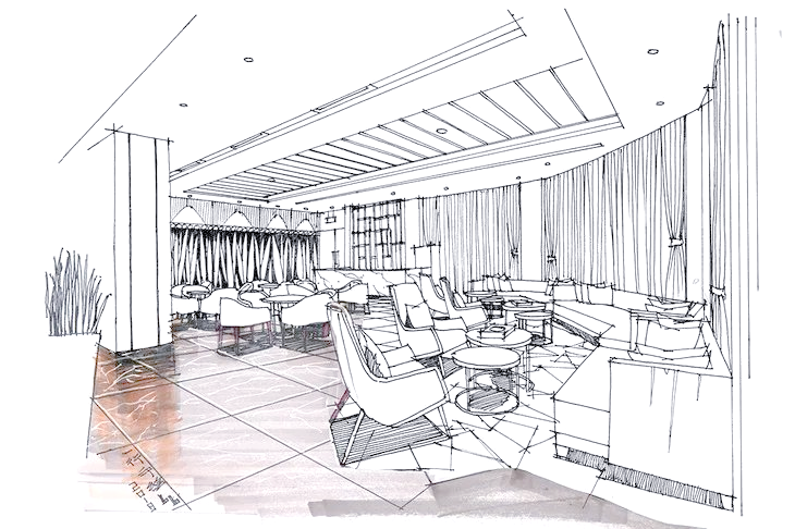 制作手绘效果图首先,要明确整体的比例关系,并着手绘制主要单体,同时要注意单体沙发之间的尺寸协调。 步骤2:接下来,我们要进一步丰富室内的墙面装饰,确保前后关系对比鲜明,同时透视感要精准无误。 步骤3:继续完善室内的顶面吊顶设计,确保整个线稿画面的和谐统一。在调整画面关系时,需要刻意加强对比,以突出重点。 步骤4:接下来,着手为室内的地面铺上暖灰色的色彩,这是整体色调的基础。在铺色过程中,特别留意投影区域,对其进行适度的加深处理。 步骤5:在完成整体色调的铺装后,需要进一步处理单体及特殊的地面铺装。特别是中心处的单体沙发,这是画面的重点,需要特别关注。而后面的沙发则可以适当弱化,以避免影响画面的中心焦点。此外,地面蓝色的铺装也是这个接待处设计的关键点,需要注意拼花的位置与颜色深浅的微妙关系,力求在方形的空间中呈现出自然的过渡,彰显出独特的设计感。 步骤6:在处理吊顶及整体画面时,必须以画面中心为设计重点,明确要表达的主题内容。切不可贪多求全,导致后景的对比度超越画面中心,从而分散了视觉焦点。这一原则至关重要,需谨记在心。 |